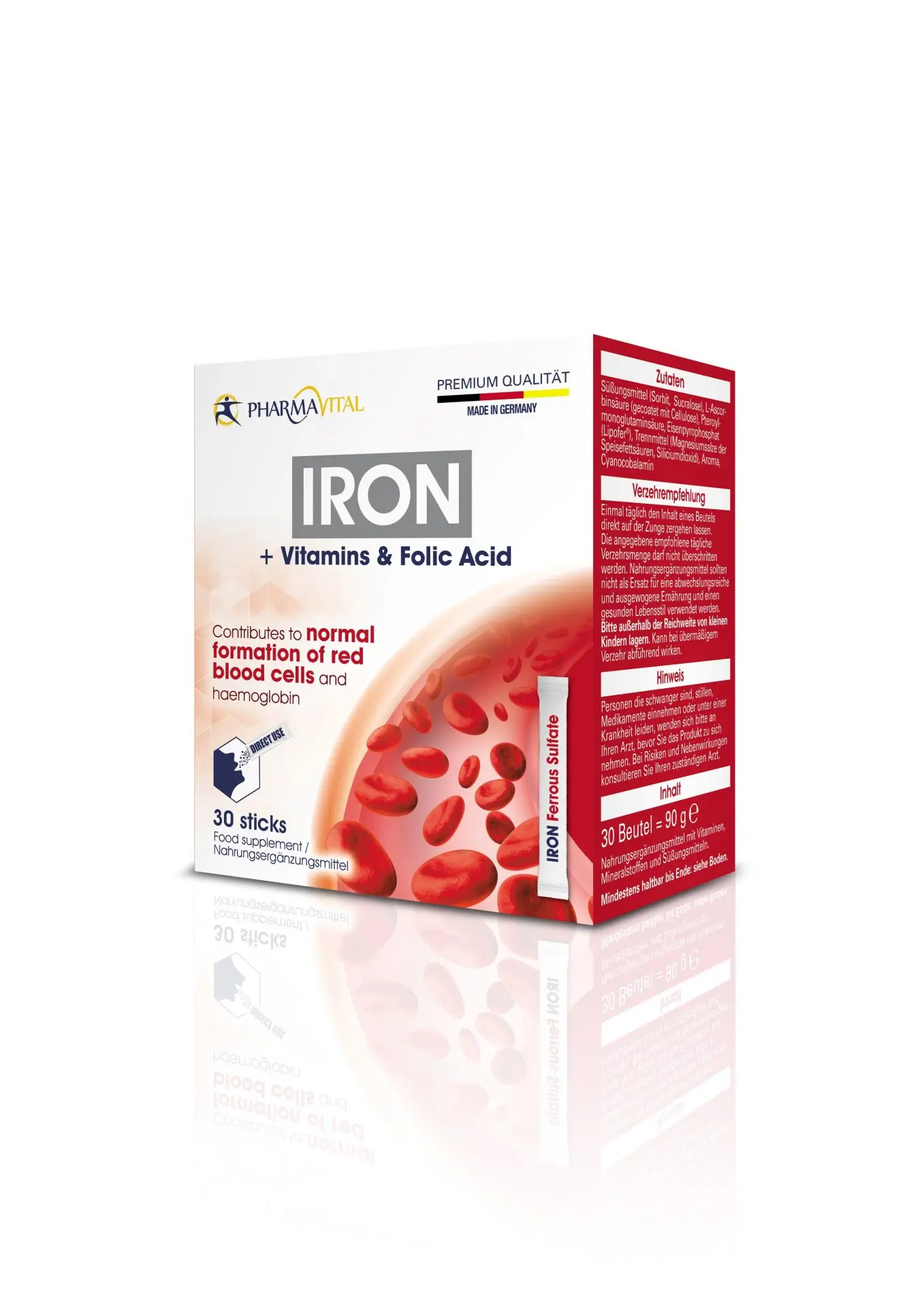 The Iron + Vitamin B12, C & Folic Acid Sticks from Pharmavital contain a valuable, coordinated complex of active ingredients and the formulation ensures an optimum supply of the ingredients. Iron has a variety of functions in the human organism, including contributing to the normal formation of red blood cells and haemoglobin. In addition, the microencapsulation of Lipofer ensures good tolerability and high bioavailability. Furthermore, vitamin C improves the absorption of iron and together the ingredients contained (vitamin C, vitamin B12, folic acid, iron) contribute to a reduction in tiredness and fatigue.
