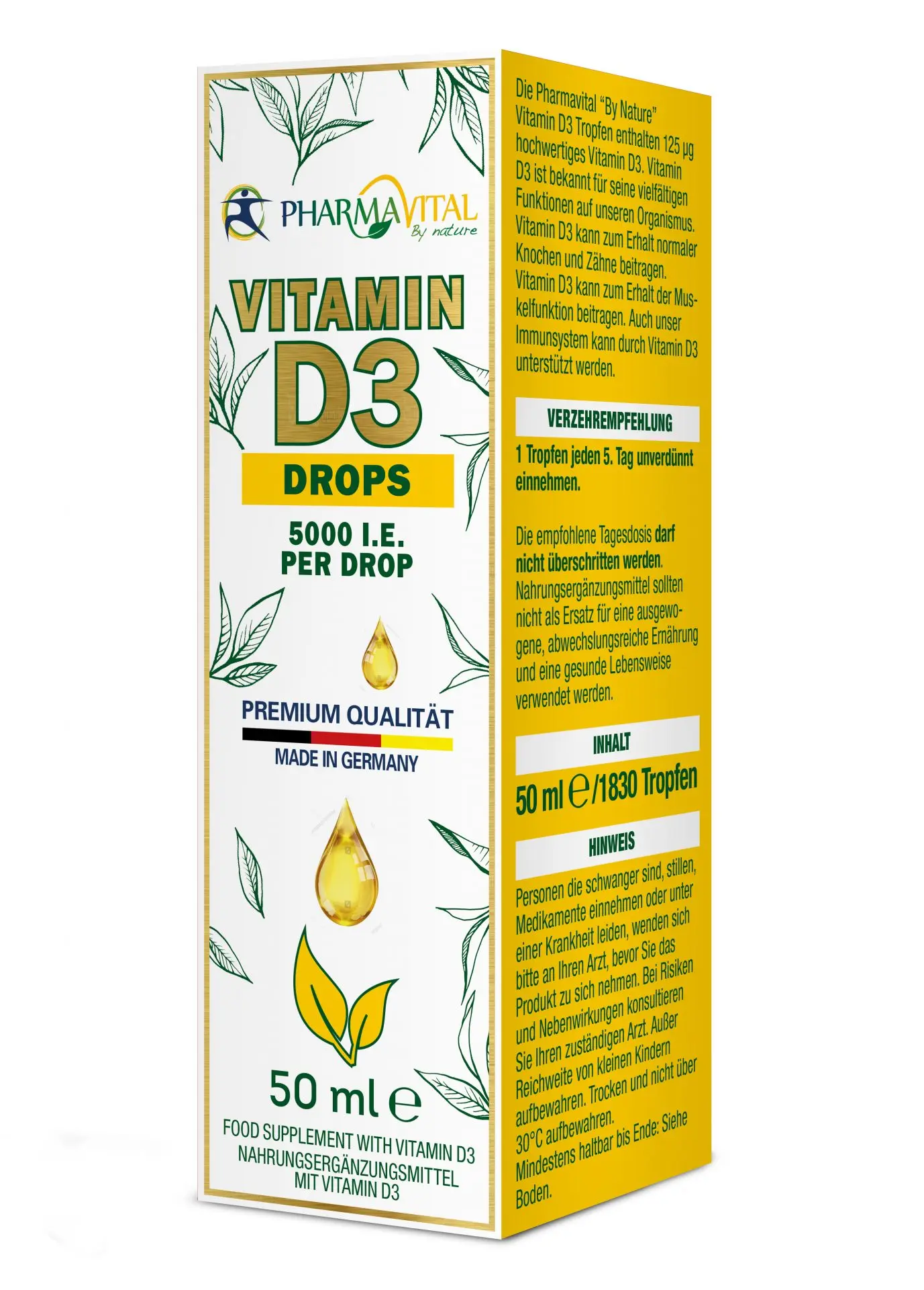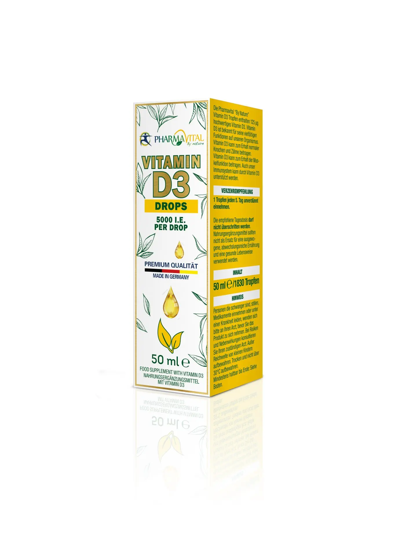 Pharmavital “By Nature” Vitamin D3 drops contain 125 μg of high-quality vitamin D3. Vitamin D3 is known for its diverse functions on our organism. Vitamin D3 can contribute to the maintenance of normal bones and teeth. Vitamin D3 can help to maintain muscle function. Our immune system can also be supported by vitamin D3.