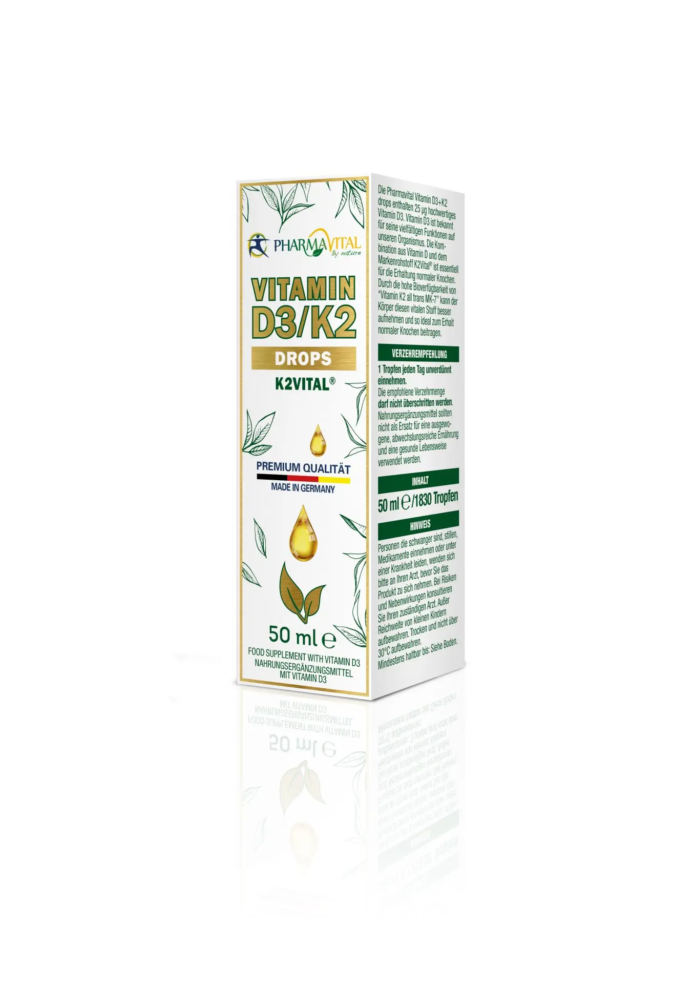Pharmavital Vitamin D3+K2 drops contain 25 μg of high-quality vitamin D3. Vitamin D3 is known for its diverse functions on our organism. The combination of vitamin D and the branded raw material K2Vital® is essential for the maintenance of normal bones. Thanks to the high bioavailability of “Vitamin K2 all trans MK-7”, the body can better absorb this vital substance and thus ideally contribute to the maintenance of normal bones.