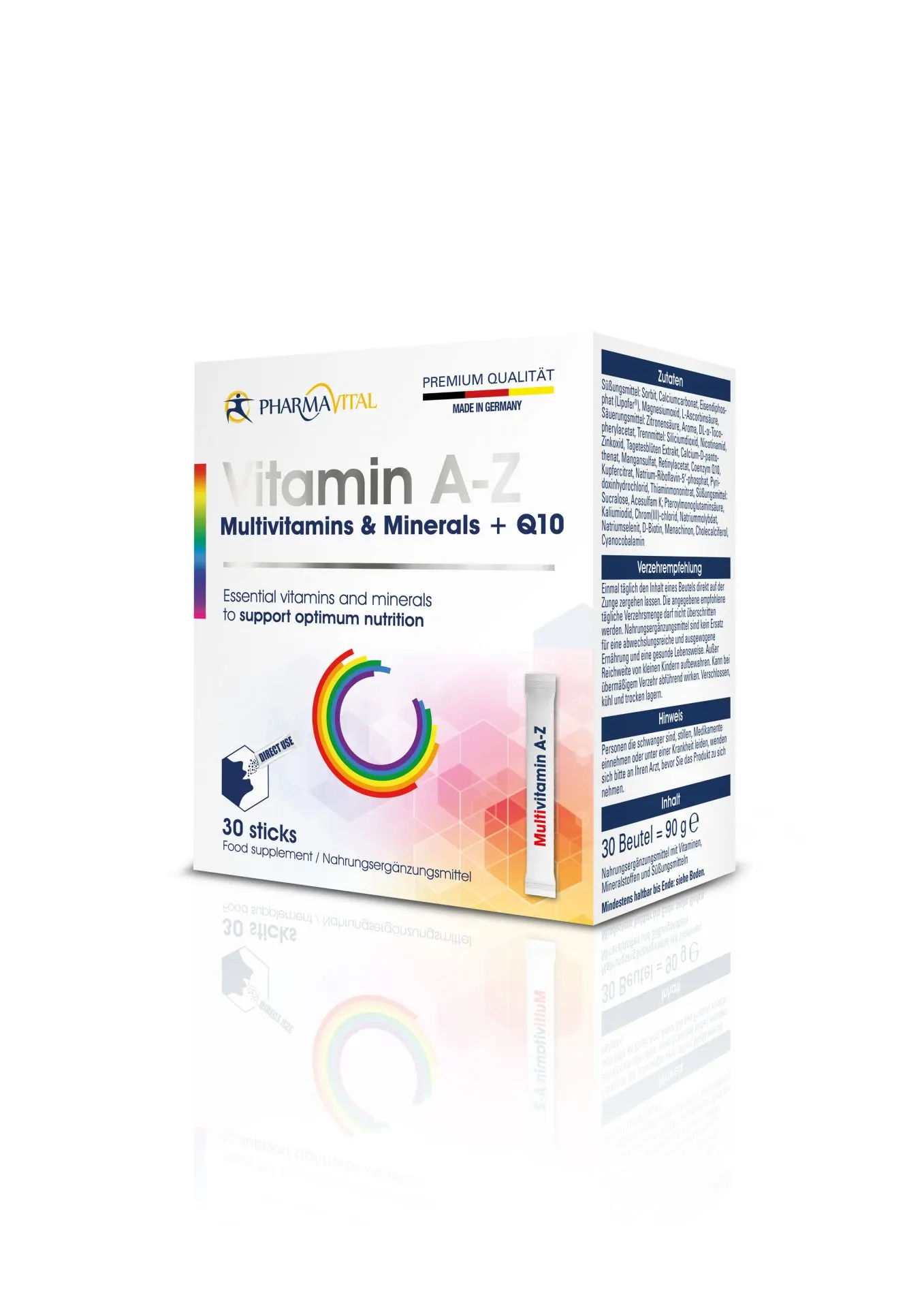 Süßungsmittel (Sorbit, Sucralose, Acesulfam K), Calciumcarbonat, Eisendiphosphat (Lipofer®), Magnesiumoxid, L-Ascorbinsäure, Säuerungsmittel: Zitronensäure, Aroma, DL-α-Tocopherylacetat, Trennmittel: Siliciumdioxid, Nicotinamid, Zinkoxid, Tagetesblüten Extrakt, Calcium-D-pantothenat, Mangansulfat, Retinylacetat, Coenzym Q10, Kupfercitrat, Natrium-Riboflavin-5’-phosphat, Pyridoxinhydrochlorid, Thiaminmononitrat, Pteroylmonoglutaminsäure, Kaliumiodid, Chromchlorid, Natriummolybdat, Natriumselenit, D-Biotin, Menachinon, Cholecalciferol, Cyanocobalamin.