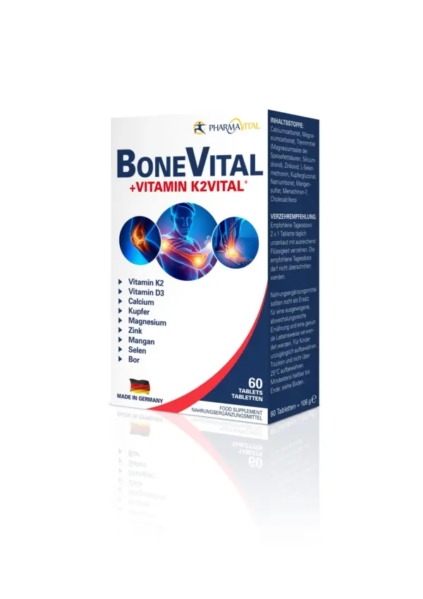 Bei bestimmten Ernährungsgewohnheiten kann der Calciumbedarf nicht immer alleine über die Nahrung abgedeckt werden. Mit den BoneVital Tabletten von PharmaVital kann die tägliche Ernährung daher sinnvoll ergänzt werden. Die Kombination aus Calcium, Vitamin D und dem Markenrohstoff K2Vital® Delta ist essentiell für die Erhaltung normaler Knochen und Zähne. Magnesium trägt zudem zu der Muskelfunktion bei. Durch die hohe Bioverfügbarkeit von Vitamin K2 kann der Körper diesen vitalen Stoff besser aufnehmen und so ideal zu dem Erhalt normaler Knochen beitragen.