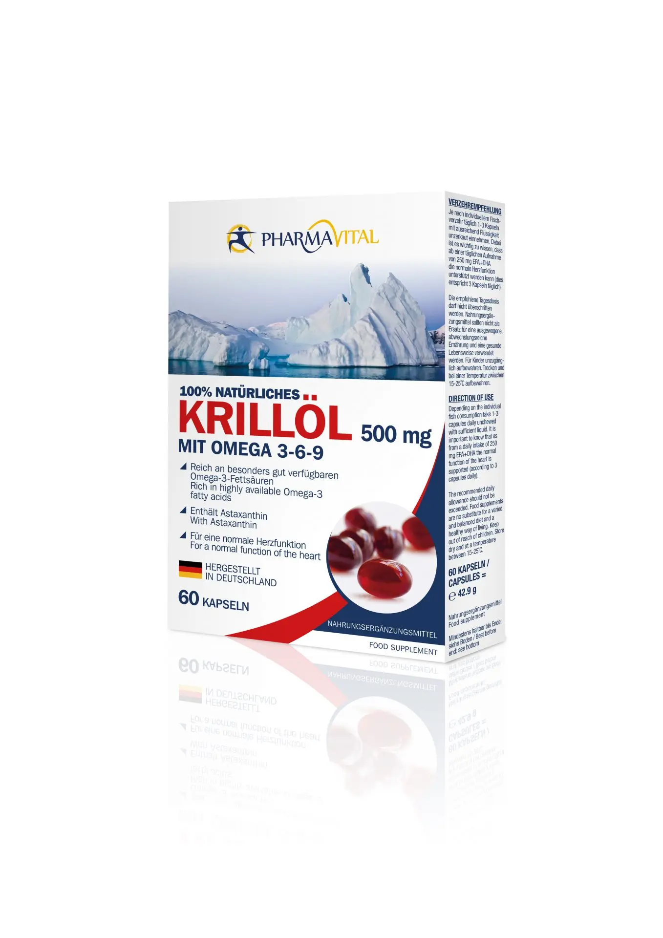 Bei Krill handelt es sich um Krebstiere, die sich in großen Schwärmen bewegen und in den Meeren der Antarktis zu finden sind. Bei dem für dieses Produkt eingesetzten Krillöl wird auf Nachhaltigkeit geachtet, um das empfindliche Gleichgewicht der arktischen Meere nicht zu stören. Ein Merkmal der Kapseln ist die für Krillöl typische rote Färbung, welche durch das natürlich enthaltene Astaxanthin hervorgerufen wird. Wegen Ihrer relativ geringen Größe und glatten Oberfläche sind die Kapseln besonders leicht zu schlucken, zudem gibt es keinen unangenehmen, fischigen Nachgeschmack. Da Krillöl reich an den Omega-3 Fettsäuren EPA und DHA ist, sind die Pharmavital Krillöl Kapseln eine gute Wahl, um die empfohlene tägliche Aufnahme von 250 mg EPA und DHA zu erreichen und somit einen Beitrag zur normalen Herzfunktion zu leisten. Sie können sicher sein, beim Kauf der Pharmavital Krillöl Kapseln die richtige Entscheidung getroffen zu haben.
