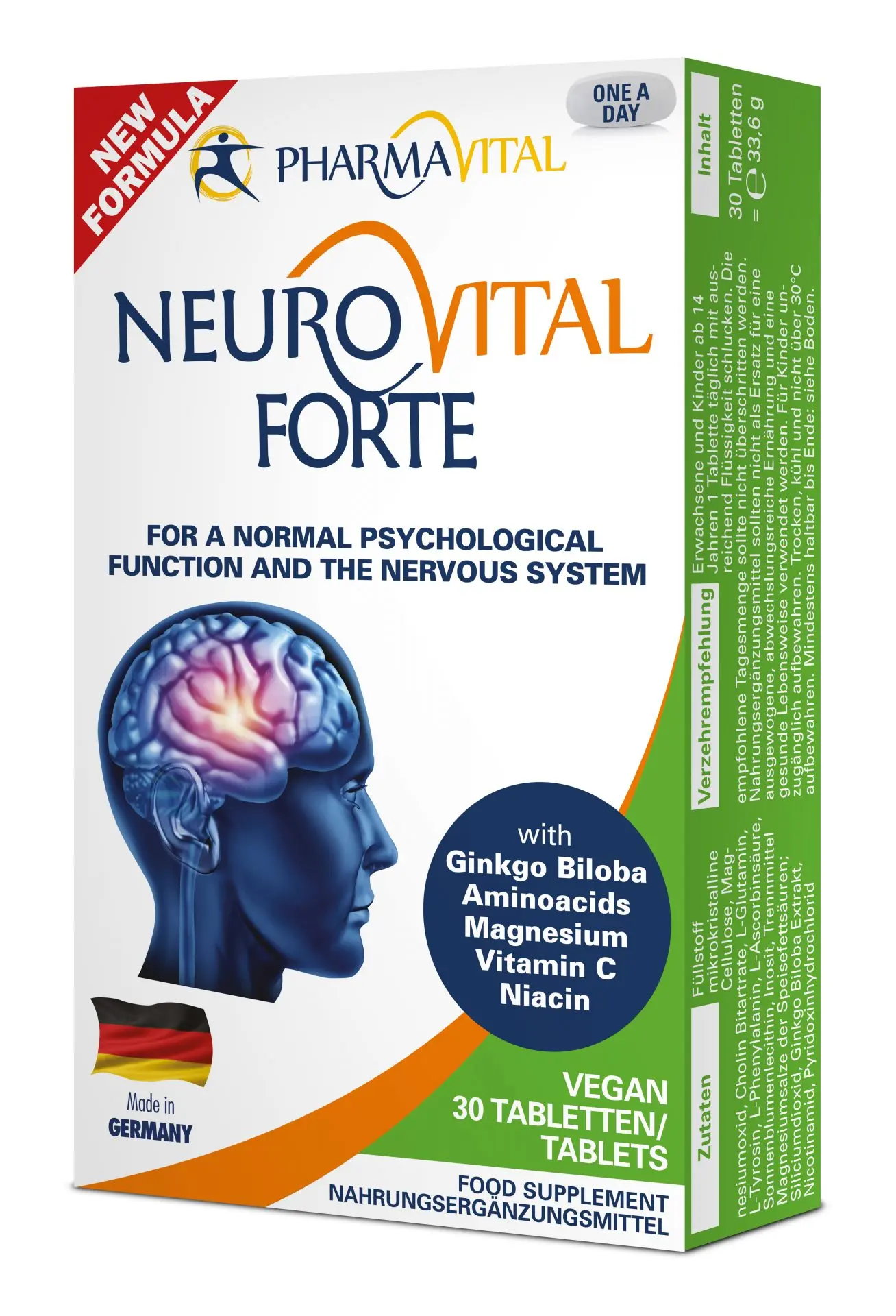 Pharmavital Neurovital Forte ist eine spezielle Nährstoffkombination mit Ginkgo Biloba, Aminosäuren, Cholin, Inositol, Magnesium und Vitaminen. Die enthaltenen Wirkstoffe Magnesium und Niacin tragen zu einer normalen psychischen Funktion, einer Verringerung von Müdigkeit und Ermüdung und einer normalen Funktion des Nervensystems bei. Darüber hinaus hat Magnesium eine Funktion bei der Zellteilung.