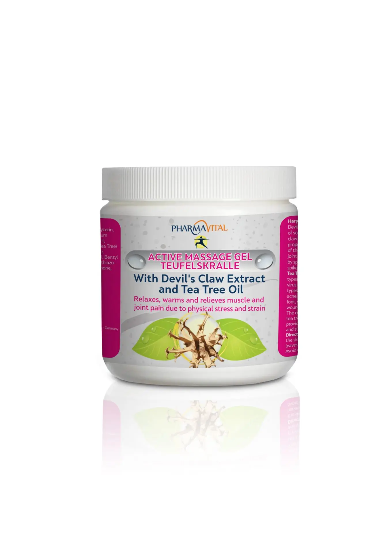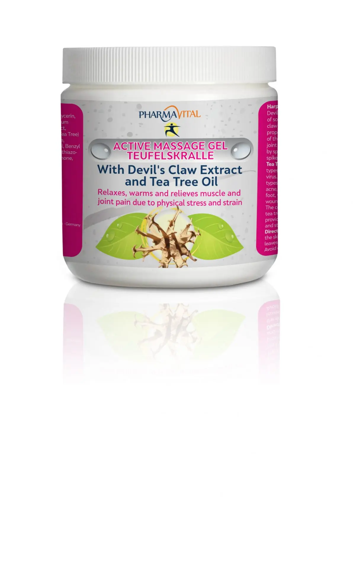 Harpagophytum procumbens, auch bekannt als Teufelskralle, ist eine in den Wüstenund Steppenregionen Südafrikas beheimatete Pflanze. Der Extrakt aus der Wurzel der Teufelskralle besitzt schmerzlindernde und entzündungshemmende Eigenschaften. Er wird zur Behandlung von Schmerzen und Entzündungen der Gelenke und Muskulatur verwendet. Darüber hinaus hilft er, die Beweglichkeit der Gelenke zu verbessern. Die Teufelskralle verschafft Linderung bei Schmerzen, die durch Sportverletzungen, Osteoarthritis, rheumatoide Arthritis, Dorne, Gicht, Bandscheibenerkrankungen und Bandscheibenvorfall hervorgerufen werden. Teebaumöl ist bekannt dafür, dass es alle drei Arten infektiöser Organismen – Pilze, Bakterien und Viren – wirksam bekämpft. Es ist ein hervorragendes natürliches Behandlungsmittel für unterschiedliche Arten von bakteriellen und pilzartigen Hauterkrankungen wie z.B. Akne, Abszess, fettige Haut, Pusteln, Sonnenbrand, Fußpilz, Warzen, Herpes, Ausschlag, Schuppen sowie andere kleinere Wunden und Reizungen. Die Kombination aus Teufelskrallen- Wurzelextrakt und Teebaumöl in Form eines Aktiv Massage-Gels sorgt für Entspannung und Linderung nach körperlicher Anstrengung und Belastung.